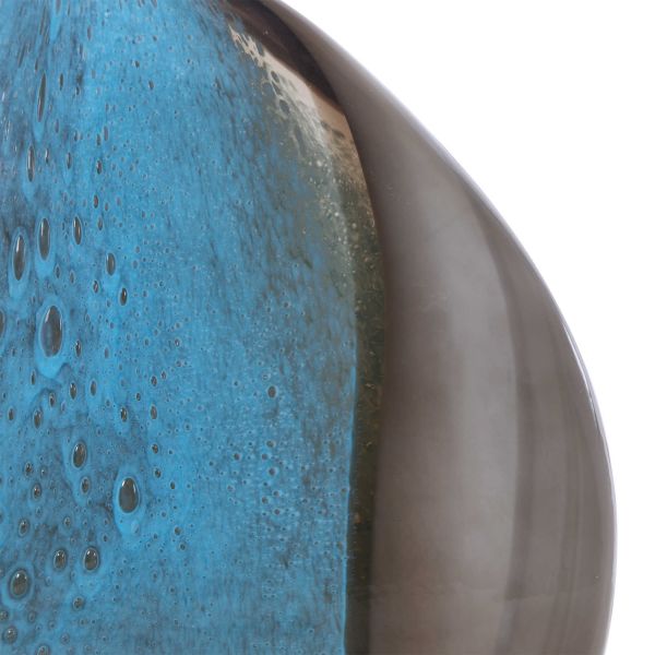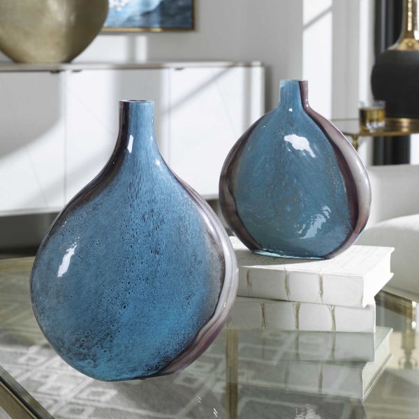 Set of two, art glass vases showcase deep cobalt blue and black hues. Sizes: S-10x11x3, L-11x14x5