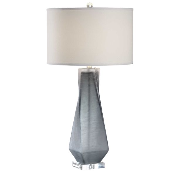Unpolished, charcoal gray glass, featuring a subtle twist shape, accented with brushed nickel highlights and crystal details. The round hardback drum shade is a light beige linen fabric with natural slubbing and matching double trim.