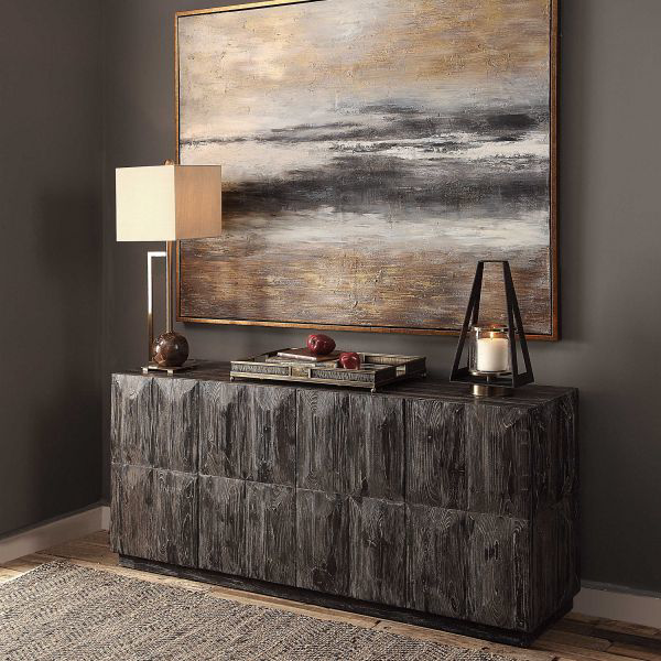 Constructed almost entirely of solid reclaimed fir, featuring bevel paneled front and sides, finished in heavily aged black with a light gray glaze and ember highlights. Three soft close doors open to one adjustable shelf in each compartment. Will show rustic signs of past usage. Solid wood will continue to move with temperature and humidity changes, which can result in small cracks and uneven surfaces, adding to its authenticity and character.