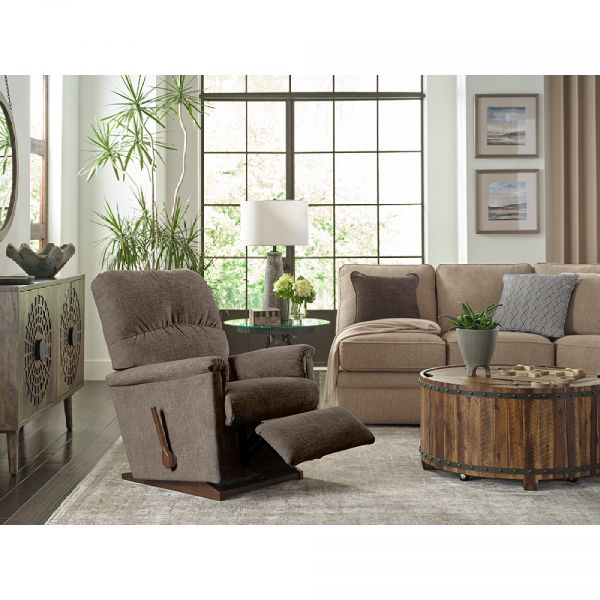 Our Collage Rocking Recliner is a family favorite that's easy to love. Its petite scale and updated style allow it to blend into just about any room. Collage features a bullnose (rounded edge) seat, padded flared arms and a decorative pull in the back cushion. Simply use the convenient handle on the outside arm to raise the legrest for reading, relaxing or watching TV. Available for special order in hundreds of fabrics!