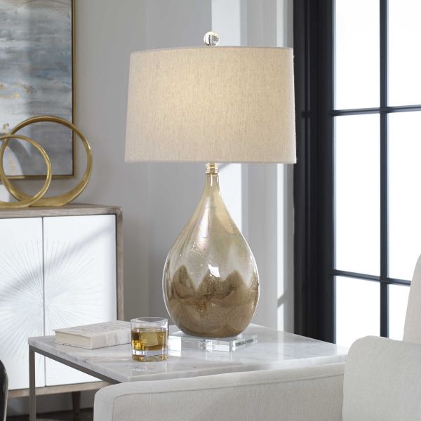 Ceramic base finished in a metallic rust beige glaze with ivory undertones and crystal accents. The slightly tapered oval hardback shade is a light beige linen fabric with natural slubbing. Due to the nature of fired glazes on ceramic lamps, finishes will vary slightly.