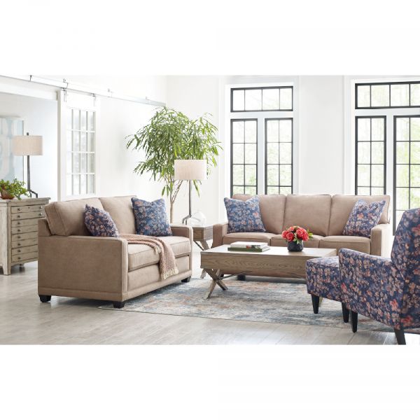 Kennedy is the sleek and casual loveseat that fits any size space. A combination of clean lines, narrow track arms, welt trim and decorative wood legs give it a classic, understated style that blends easily with any decor. Patented ComfortCore® cushions provide just the right amount of support for a long or short sit. Make it yours with your choice of fabrics and other available upgrades. Includes two 20” accent pillows. A matching ottoman is available separately.
