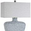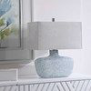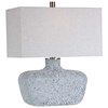 This table lamp features a heavily textured art glass base with a handcrafted look in mottled highlights of blue-green, covered in an aged white frosted glaze, paired with brushed nickel plated details. The rectangle shade is a light gray linen fabric with natural slubbing.