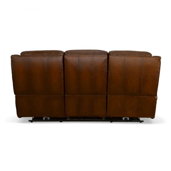 Give your home a bold centerpiece with the Mustang Power Reclining Sofa with Power Headrests. High on style and support, this sofa features an intricately stitched pattern—reminiscent of cowboy boots—on the arms. Fully upholstered in a premium quality full-grain leather, the luxurious finish offers a natural look with unique characteristics that will only be further enhanced with the passing of time. Other Western-inspired design features include stylish contrast stitching on the seams. Sitters on each end can comfortably recline using the power controls in both arms. The controls independently adjust the headrest and recline for individualized comfort and have built-in USB charging ports to keep devices powered up and ready to go. Sink into the plush, divided back cushions and contoured bucket seats, while fully padded footrests keep your feet and legs happy. Reinforced by our patented DualFlex Spring System™, which ensures a mix of firmness and flexibility as you sit, the Mustang sofa is designed to last a lifetime.