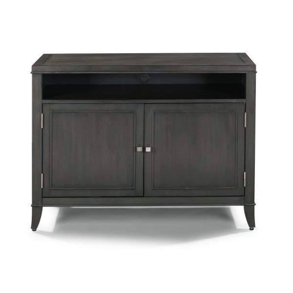 Contemporary design with classic art-deco inspiration. The 5th Avenue TV Stand by homestyles is crafted of poplar solids and mahogany veneer over engineered woods. A hand-rubbed grey sable finish reveals the mahogany veneer grain. Two doors with frame detail open to two storage areas with one adjustable shelf in each. One upper, open shelf for media components. All storage areas have electrical cord access in the back. Assembly required. Delivered to your door by home delivery service. Measures: 32"H x 44"W x 18"D.
