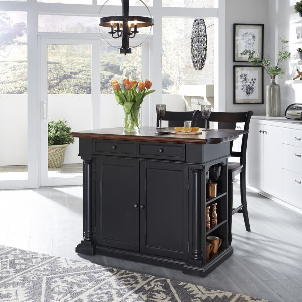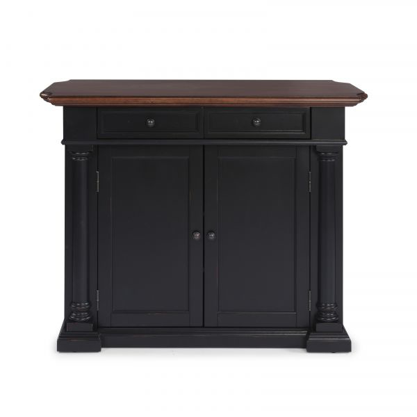 This Alexander Kitchen Island by homestyles features an Americana design with classic, solid wood, carved columns. Crafted of hardwood solids with engineered wood panels. Shaped, solid wood top is finished in an aged cherry. The body of the Island has a black painted finish with aged rubbed-through edges. Two framed upper drawers with two framed lower doors. Each door has a separate storage area with two adjustable shelves. Two adjustable side shelves offer additional storage or display. Aged antiqued nickel pulls. Drop leaf extends the depth of the top to 36.5"D. Solid wood framed shaped base adds to the Americana design. Finish and measurements may vary. Assembly required. 36"H x 48"W x 25"D.
