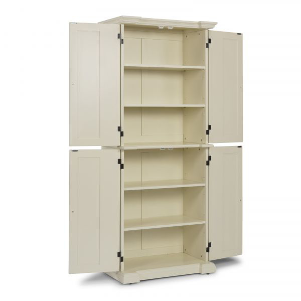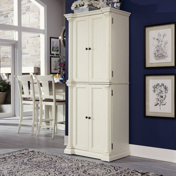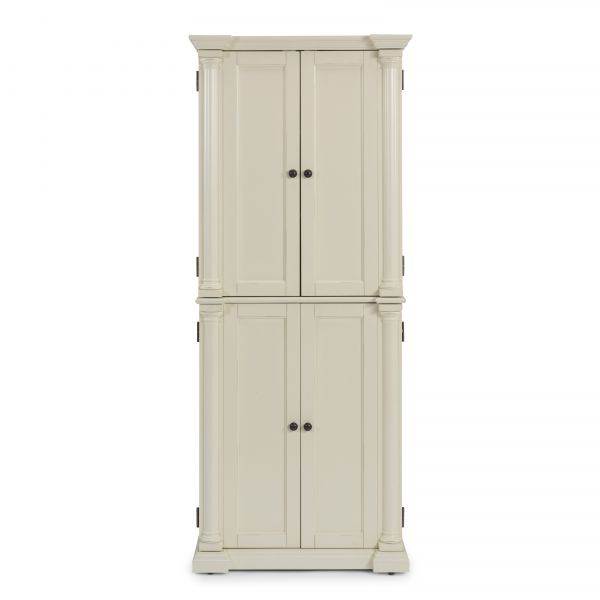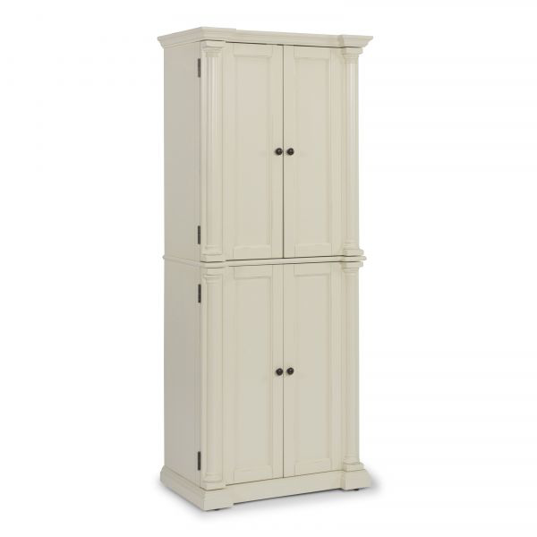 This Alexander Pantry by homestyles features an Americana design with classic, solid wood, carved columns. Crafted of hardwood solids with engineered wood panels in an off-white painted finish with aged rubbed- through edges. Two large storage areas behind the upper and lower framed doors feature two fully adjustable shelves. Aged antiqued nickel door pulls. Solid wood-framed shaped base and top adds to the Americana design. The ideal addition to any kitchen, but can be used in any room where added space is needed. Finish and measurements may vary. Assembly required. 72"H x 30"W x 18"D.