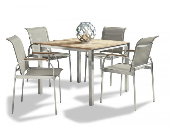 Lounge outdoors in comfort and style with the Aruba 5-Piece Gray Outdoor Dining Set by homestyles. The table and four chairs have polished stainless steel frames that are weather-resistant. The slatted solid teak table top and arm pads are finished with natural linseed oil to be water-resistant. Each chair features a contemporary sling-style seat and back, built to withstand the elements. The lower- and upper-back frame supports add both stability and comfort. Table: 30.5"H x 39"W x 39"D. Chair: 36.25"H x 21"W x 25.5"D.