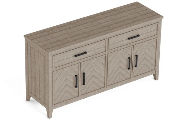 Store all your serveware in nature-inspired style with the Chevron buffet, an essential dining room companion that brings unexpected modern convenience to the art of casual entertaining. Integrated outlets and USB ports provide power to slow cookers and food warmers and keep devices charged, while keeping cords neatly out of the way. Featuring two cabinet spaces with shelves and two roomy soft-close drawers, this buffet offers ample storage for dining essentials. A striking chevron patterned top, cast-iron finish hardware and gently tapered legs create a casual yet sophisticated modern farmhouse look. Available in either a Stone Gray or Ebony finish, this buffet can be selected in a contrasting finish from other Chevron dining pieces to add character and visual interest to dining spaces.