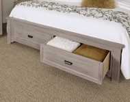 Arched headboard featuring horizontal planks and solid wood posts. Functional storage drawers in the arch bed's low profile platform style footboard make this bed useful and stylish. Use the handy drawer space for clothing, linens, or accessories.