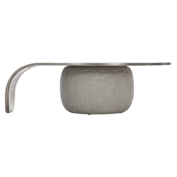 Create a memorable style with a distinctive cocktail table crafted in cast aluminum and cast concrete. Innovative form and unique materials are the basis for this high-impact cocktail table. Designed with a teardrop shape cast aluminum surface supported by a textured cast concrete base, the Kaori cocktail table is a study in nonconformist style. It is both modern and primitive, industrial and sleek, crafting a uniquely balanced design.