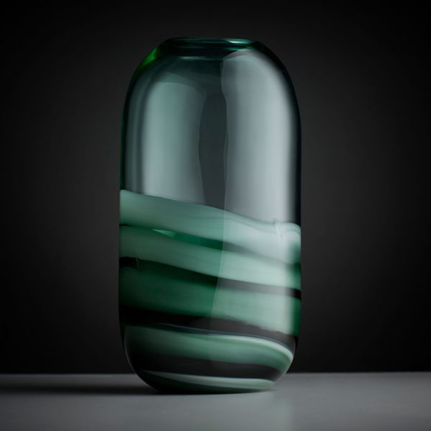 Add an abstract design to your tabletop ensemble with the Torrent vase. Available in three different size options, these subdued white and green swirled accents, feature a translucent surface from top to bottom. This contemporary vessels is ideal for your seasonal floral arrangements. Constructed from 100% recycled glass, this vessel is suitable for any style design: modern, traditional, or transitional.