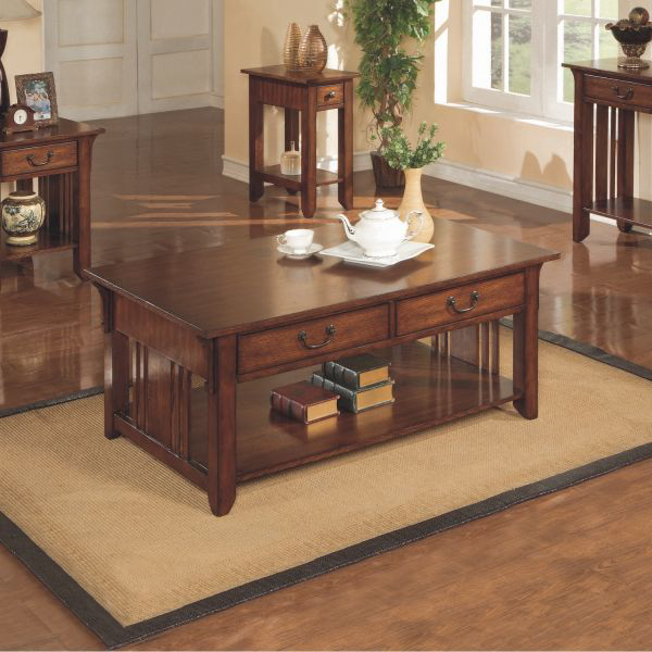 Mission-styled tables, constructed from oak veneer and hardwood in a medium oak finish. Economically priced and built for years of enjoyment. All wood drawer construction with wood-on-wood drawer glides.