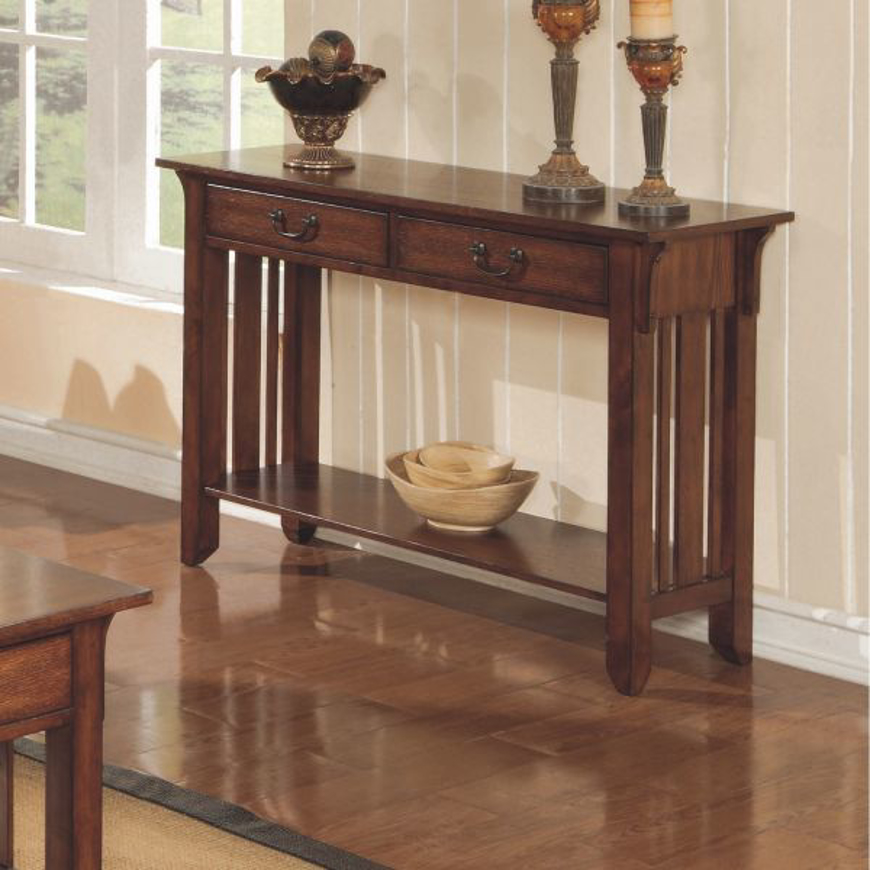 Mission-styled tables, constructed from oak veneer and hardwood in a medium oak finish. Economically priced and built for years of enjoyment. All wood drawer construction with wood-on-wood drawer glides.