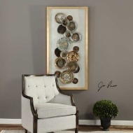 A collection of hand painted multicolored plates, artfully arranged over a white backing, mounted in a metallic gold leaf finished pine wood shadow box. May be hung horizontal or vertical. Two sets shown.