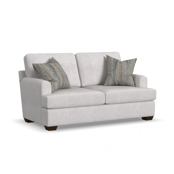 The Olivia loveseat embodies classic charm and modern durability. It features clean lines along the T-cushion mailbox arms and box-border back cushions, while reversible Comfort Coil seat cushions deliver enduring comfort and resilience. Accompanied by two square accent pillows, this loveseat brings a touch of elegance to any space, supported by a robust kiln-dried wood frame and chic square-tapered legs.
