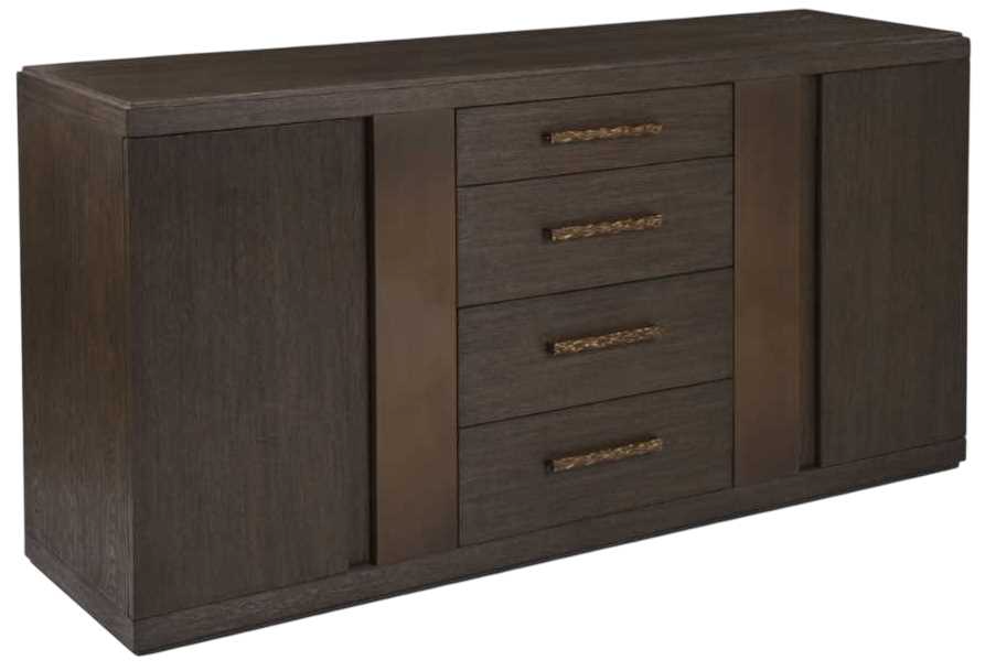 Contemporary designs made from wire brushed quartered white oak veneers and premium hardwoods in a rich, dry brown crafted finish, safeguarded by a protective topcoat, with antiqued brass accents and hardware.