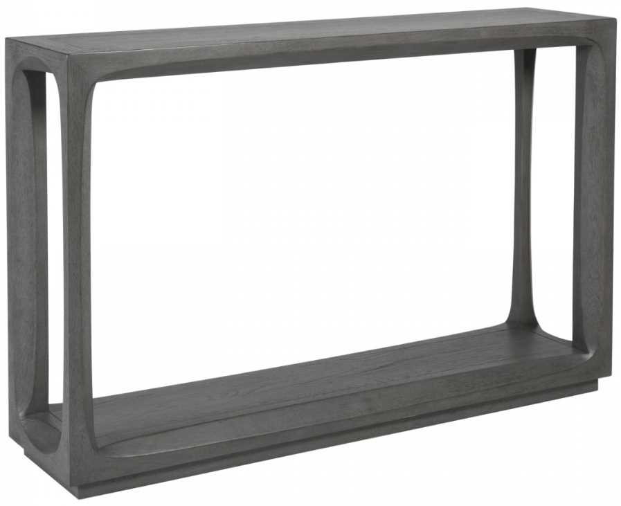 The top and bottom shelves are crafted from flat-cut veneers in a starburst pattern, with legs and rails routed in a continuous ellipse, shown in a medium gray wire-brushed finish.Read More