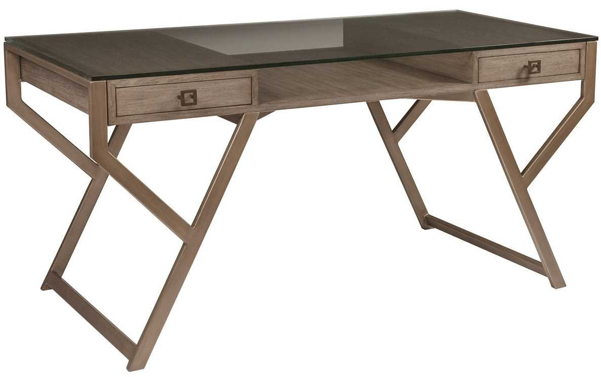Contemporary writing desk crafted from Mahogany solids and veneers with a warm metallic finished frame and hardware and a tempered glass top. The Grigio finish is a warm gray tone with wire brushing.Read More