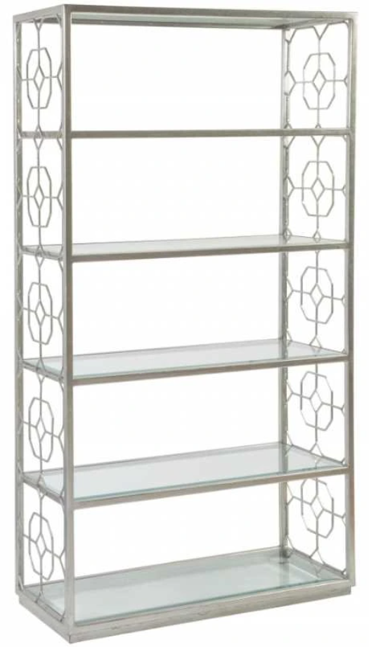 Hand-forged iron frame with six stationary, 1-inch beveled, tempered glass shelves. Shown in the silver leaf finish, a true silver leaf with an antiqued effect, but also available in all Artistica Metal Designs finishes.Read More
