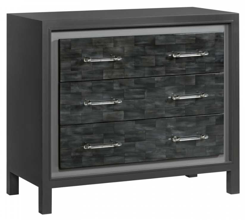Faux horn motif hand-painted by artists on individual resin tiles in a dark gray bone coloration with custom acrylic hardware and bright nickel finished clasps which are located on each of the three drawers. Faux horn tiles will vary in appearance and coloration from piece to piece.Read More