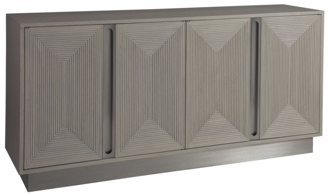 Contemporary design crafted from white oak solids and quartered oak veneers in our cerused white grey finish. Four doors feature panels in a concentric recessed pattern of small half-round moldings, two drawers, two adjustable shelves, ventilated back, inset hardware and plinth base in brushed stainless steel.Read More