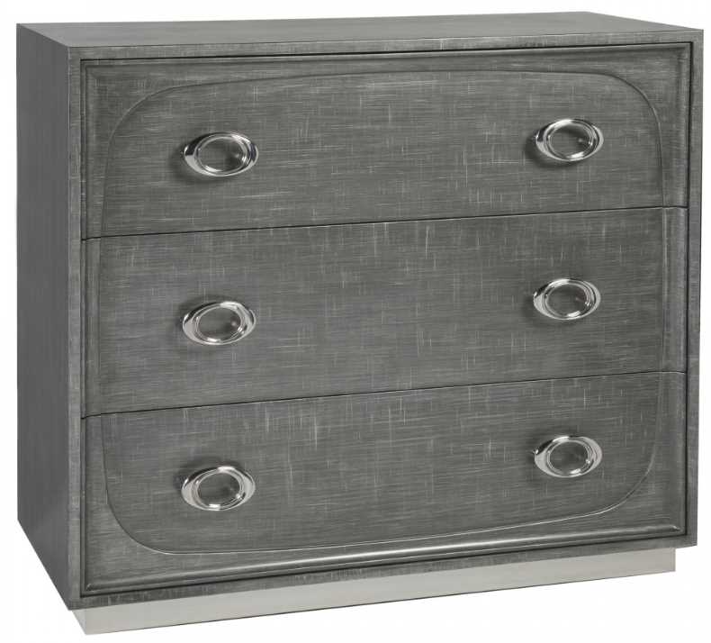 Contemporary design in Beech solids and Maple veneers hand-painted by artists in a gray and silver crosshatch pattern over silver leaf, enhanced by the true lacquer finish. The three drawers have soft-close guides, with brushed nickel hardware and a plinth base.Read More