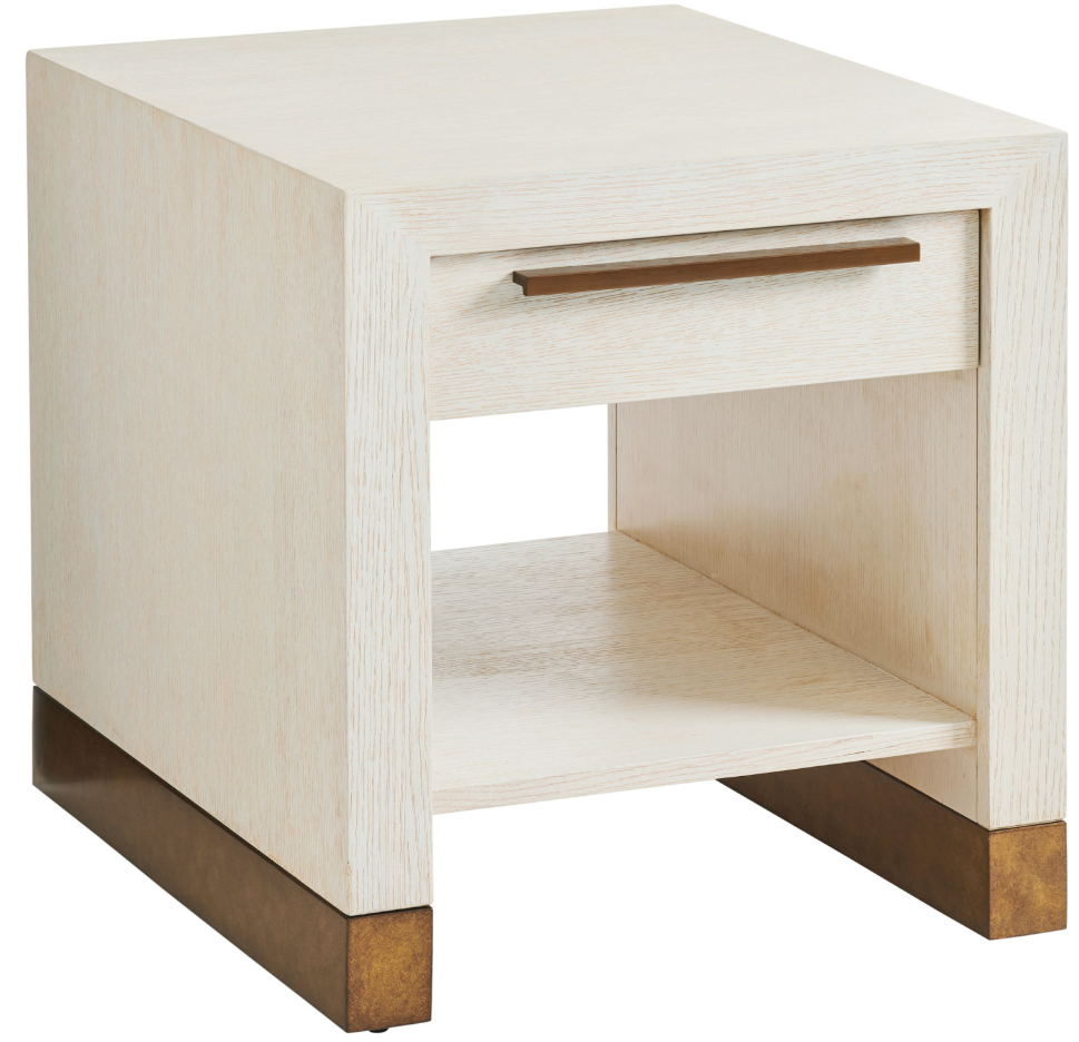 The Huckleberry end table features a single drawer at the top and stationary wooden shelf beneath, both slightly recessed within the mitered frame. Note the decorative Calais brass metal trim on the base and the coordinating elongated drawer pull bring out the white oak wood grain finished in winter white with camel understones.Read More