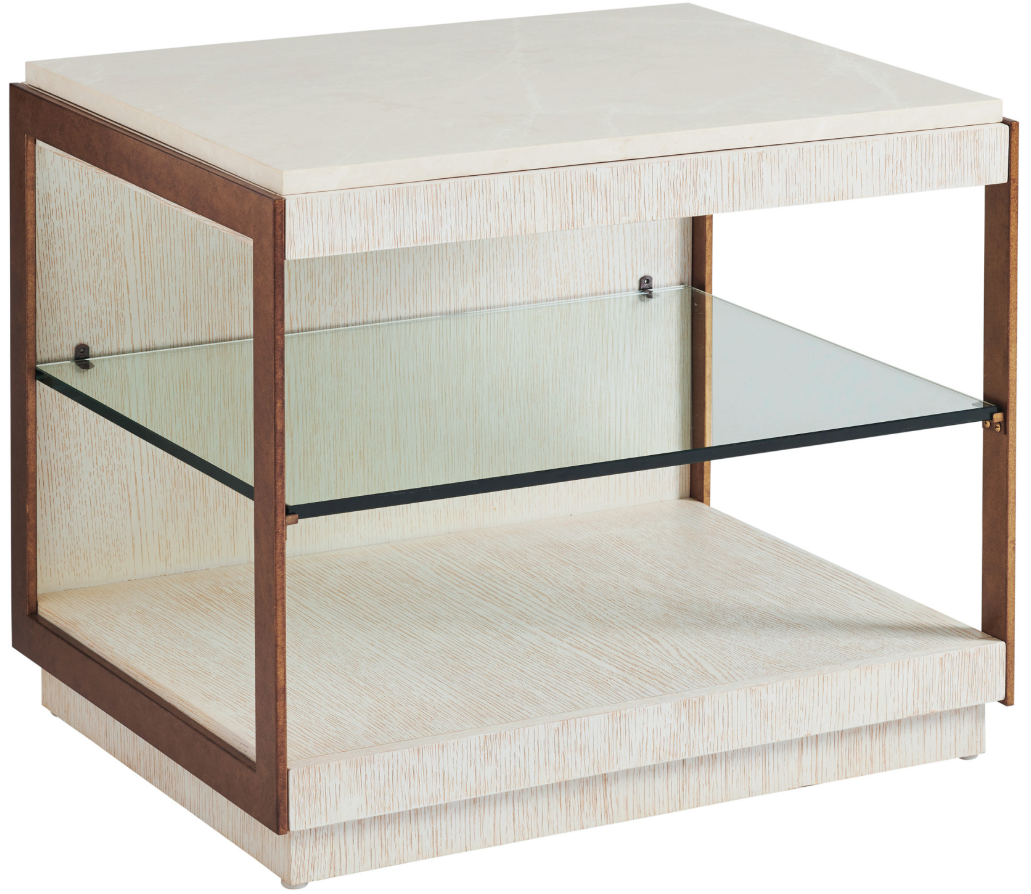 The Point Lobos marble end table has a Calais brass metal frame on the sides with a Concours marble top and glass center shelf. There is a wooden privacy panel on back. The design can also be turned so that the privacy panel faces the end of the sofa.Read More