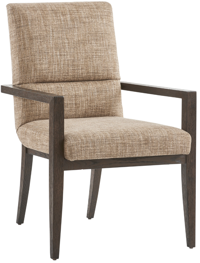 The upholstered seat appears to gently curve within the wooden frame providing lower lumbar support and a soft curvature of the back legs as they taper towards the floor. The standard fabric is 225771 Peak, a woven construction, performance fabric, with a subtle herringbone pattern in shades of chocolate brown, taupe, and ivory.Read More