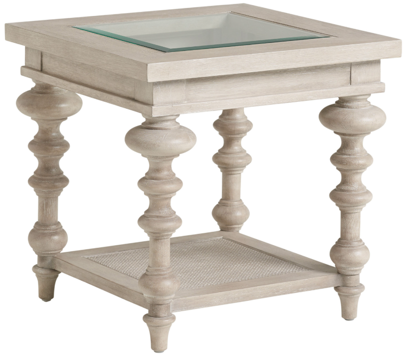The Castlerock end table offers a neo-traditional look, with turned legs, a beveled glass top and woven cane shelf at the base. There is a matching cocktail table with the same name.Read More
