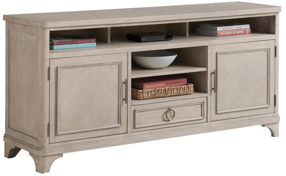 The Rocky Oaks Media Console features open storage and a sound bar compartment across the top, with open storage, and a drawer below in the center section. The left and right doors open to adjustable shelves.Read More