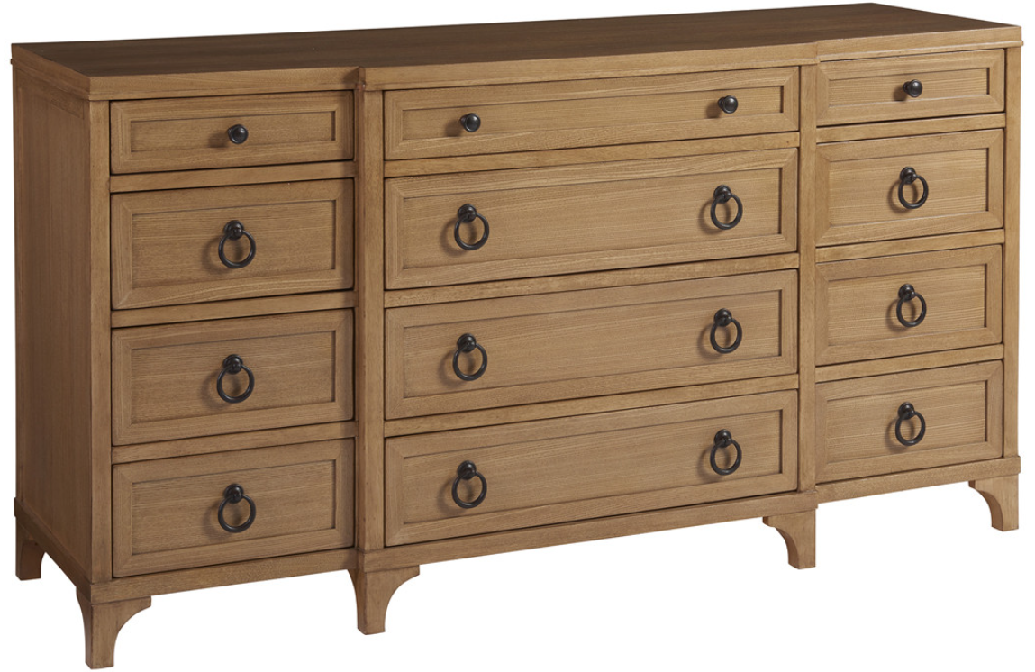The traditional lines of the Garnet breakfront dresser give it a classic vibe, shown in the Sandstone finish, yet also available in Sailcloth as 921-233. Twelve full-extension self-closing drawers offer generous storage.Read More