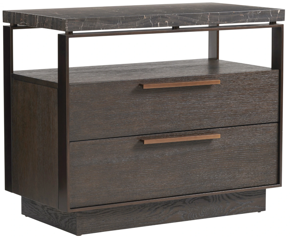 The exceptional design includes an Alpine marble top floating over a metal frame. Beneath the open compartment are two storage drawers with soft-closing drawer guides sitting on a plinth base. As with any natural marble, the veining pattern will be unique to each piece.Read More