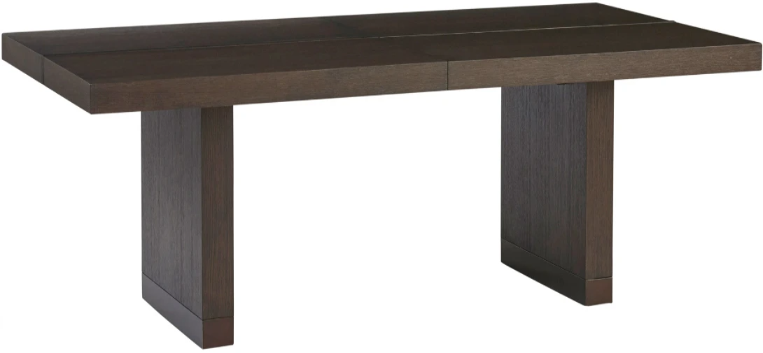 The rectangular dining table has a decorative metal insert that runs the length of the table, as well as on the two 20-inch leaves which extend the table to 128-inches. The two wooden leg panels supporting the table have a decorative metal base in a burnished bronze finish.Read More