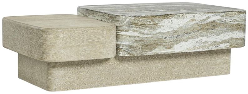 Monolithic shapes in organic materials create this stunning Arcadia cocktail table. Striated faux stone in kalta finish forms one tier of the top, with cast resin in a ceruse woodgrain clay finish crafting the second tier and the plinth base.Read More
