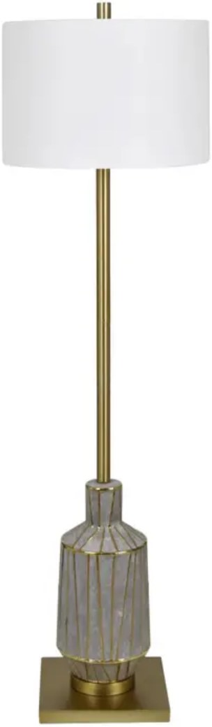 The Crestview collection Caldwell floor lamp showcases striking contrasts with its matte glaze intersected by bold metallic gold accents. The oversized brushed brass base adds visual interest, while the exaggerated components and white linen shade complete the design, making it a standout piece for any modern or transitional decor.Read More