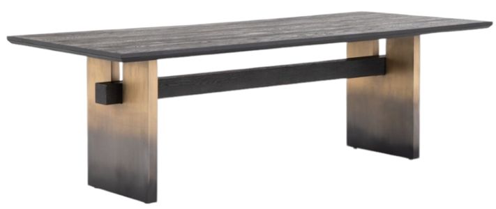 Wide, plank-style legs of brass-finished stainless steel feature an ombre pattern for eye-catching effect, with an intersecting beam adding intrigue. A rectangular black oak tabletop flaunts its materials' natural graining, for a richly organic takeaway.Read More