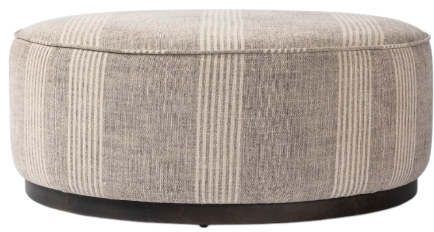 Upholstered in a classic cream-and-grey striped flax/linen blend and paired with a solid brown wood base, this large, round ottoman can be placed just about anywhere, bringing with it a traditional vibe. Style with a tray as a design-forward coffee table.Read More