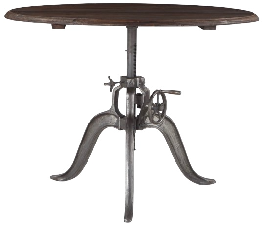 Adjustable crank mechanism on the base can be turned either raise or lower the table's height from 31 to 41 inches