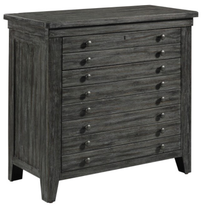 The Kincaid® Acquisitions Brimley Map Raven Bachelor's Chest combines refined character with practical storage. Finished in a deep raven tone with a map-inspired motif, it features multiple drawers accented by classic hardware. Its bold design and rich texture make it a striking statement piece for any bedroom.Read More