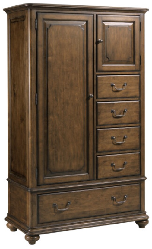A statement bedroom piece in the Commonwealth solid wood furniture collection, the Witham Gentlemen's Chest features five drawers and two doors in an asymmetrical layout. Behind the tall door there are three adjustable shelves while the smaller right-side-facing door houses one adjustable shelf. This piece adds interest and center-piece type scale to the bedroom.Read More