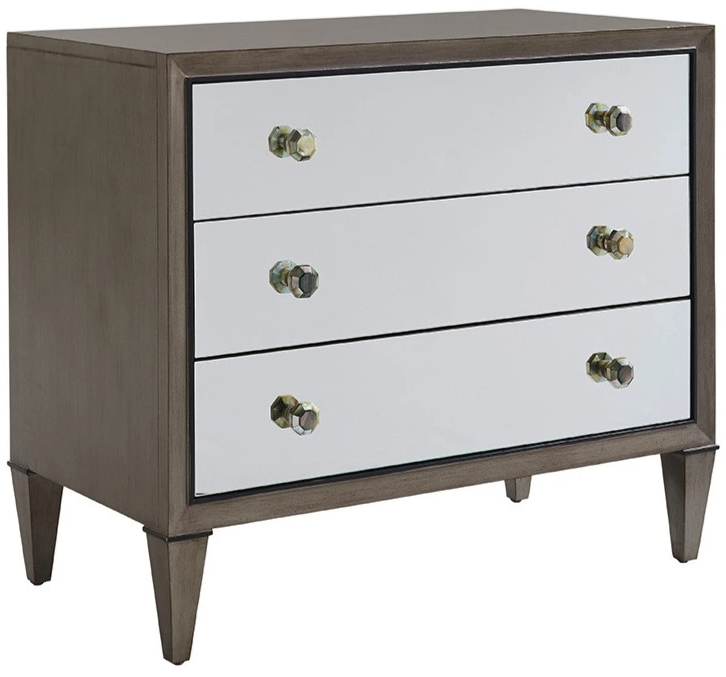 Bedside storage presents a touch of glam with mirrored drawer fronts and distinctive octagonal pulls made from abalone shell. The three full-extension self-closing drawers with silver-gray painted interiors provide ample storage and a smooth surface.Read More