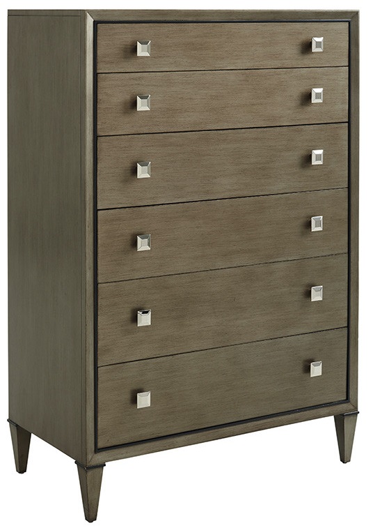 Vertical storage makes the most of square footage and the graduated drawers are ideal for varying wardrobe elements. Six full-extension self-closing drawers feature painted interiors in a silver gray coloration which complements the charcoal gray bead molding on the beveled face frame and at the top of the tapered leg.Read More