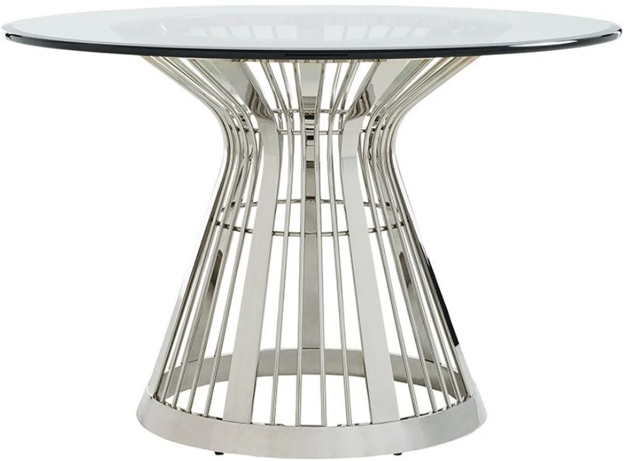 The stainless-steel base is coated with a custom platinum finish providing a rich silver patina. The hourglass design elegantly highlights the contemporary design. Paired with a 54-inch glass top, the pieces serve as a beautiful center table or small dining table.Read More
