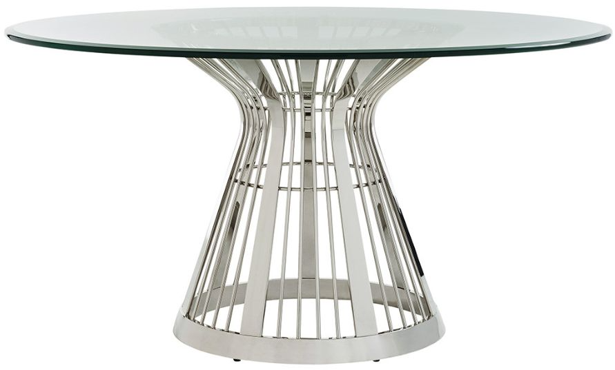 The stainless-steel base is coated with a custom platinum finish providing a rich silver patina. The hourglass design elegantly highlights the contemporary design. The 60-inch glass top will comfortably seat 4-5 guests.Read More