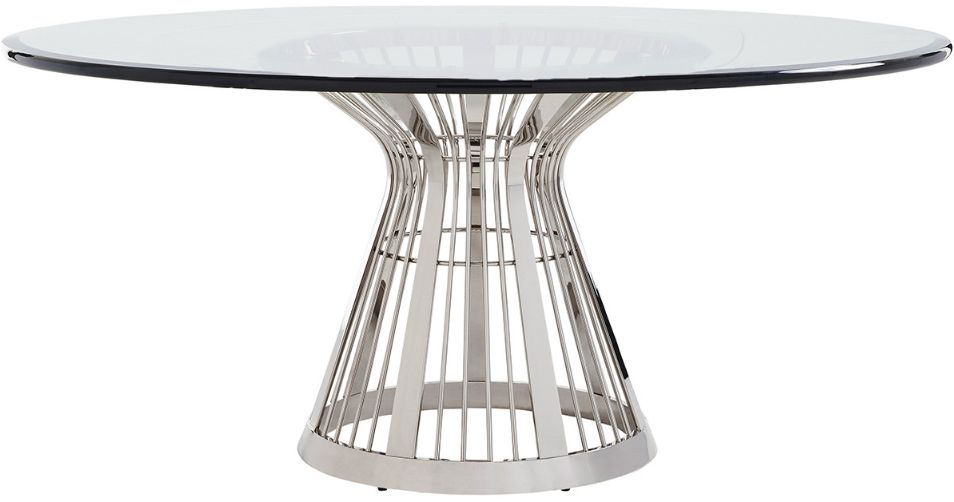 The stainless steel base is coated with a custom platinum finish providing a rich silver patina. The hourglass design elegantly highlights the contemporary design. The 72-inch glass top will comfortably seat 5-6 guests.Read More