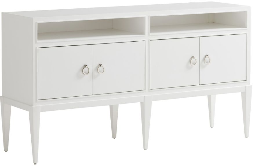 The 65-inch Cedar Lake sideboard features a handsome design with exceptional functionality for the dining room. The open area at the top provides easy access to key serving items while four doors below offer concealed storage. Behind each door is one adjustable shelf. Note the elegant pendant hardware in polished nickel.Read More