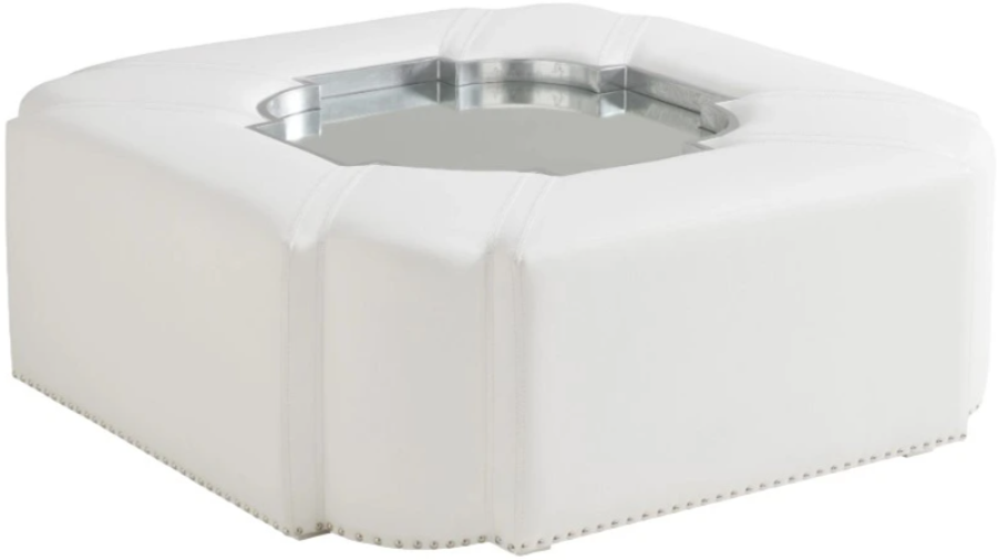 The 48-inch square Clarendon cocktail ottoman features a striking bracket-corner design with a mirrored serving tray in the center. The piece is available exclusively in a winter white faux leather with double saddle stitching and spaced nailhead trim around the base.Read More