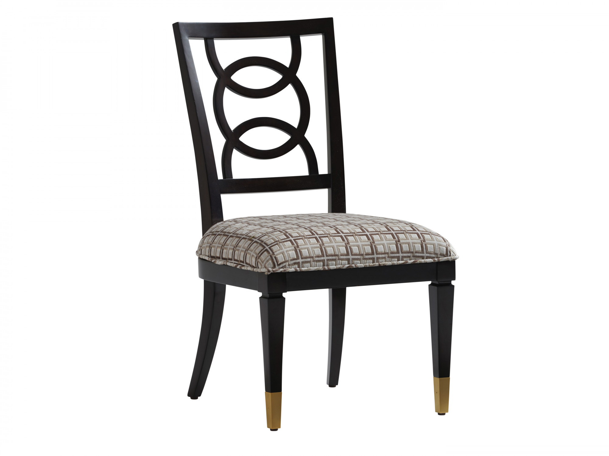 The Pierce arm and side chairs showcase the dramatic intersecting ring design on the chair back, paired with a comfortable upholstered seat and tapered legs with satin gold ferrules.Read More